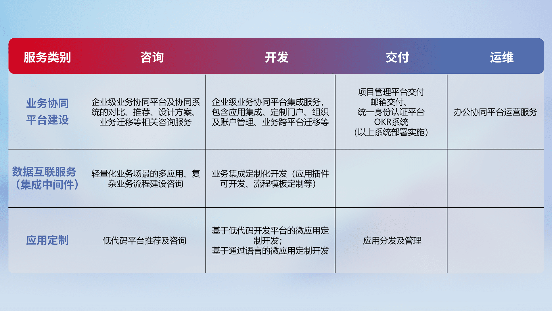 针对钉钉、、企微、、、、IDaas等平台级产品提供产品的规划、、方案、、、交付、、、、定制化开发等服务,,,实现如统一协同办公、、、、智能客户服务、、、混合会议管理、、智能数据查询、、、等业务场景,,实现数字化转型。。