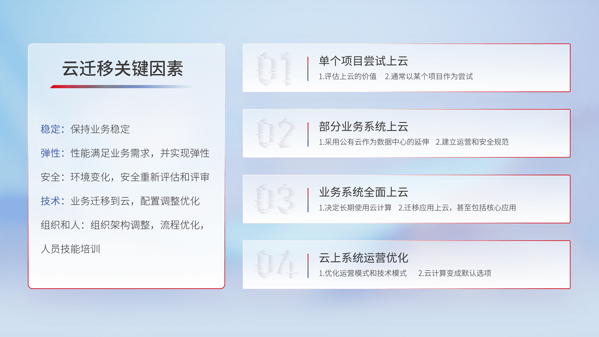 结合实际业务,,,,从规划设计、、、、云平台选型、、、、云原生改造、、、、数据迁移、、、集成交付,,,迁移全过程为客户识别最佳上云路径,,,做好风险识别管理,,,设计网络架构、、身份权限、、安全审计合规、、操作审计、、、日志审计、、监控告警策略、、多站点容灾设计等,,对云上基础设施进行整体规划,,,,提升IT治理水平,,以满足弹性、、、、高可用、、、、高性能的需求。。。。