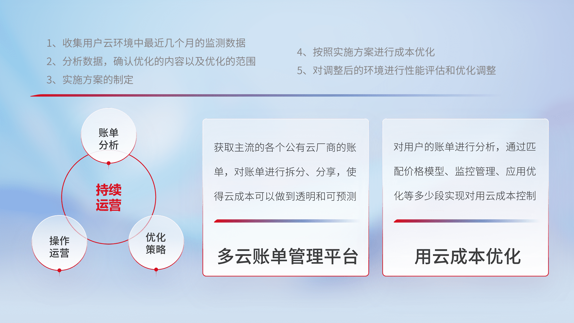 通过多云纳管,,,,以统一的资源数据模型把客户的云资源进行抽象和封装,,进而实现对多云资源的统一操作,,保障云资源管理的可靠性、、、稳定性与可用性。。量身定制化运维内容,,配置、、、、开发运维、、、、补丁管理、、、备份、、、、监控、、认证和访问管理、、、审计和日常巡检等,,保障在用云过程中的可靠度,,,,稳定度以及高可用率。。